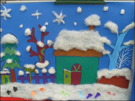 瞧!一群快乐的小朋友带着笑声在和棉花变魔术,他们将棉花粘贴在纸上:美丽的喜羊羊、可爱的懒羊羊、慈祥的老村长,还有抱着萝卜的大白兔、漂亮的雪人,一个个活灵活现的出现在我们面前,真让人忍俊不禁。
