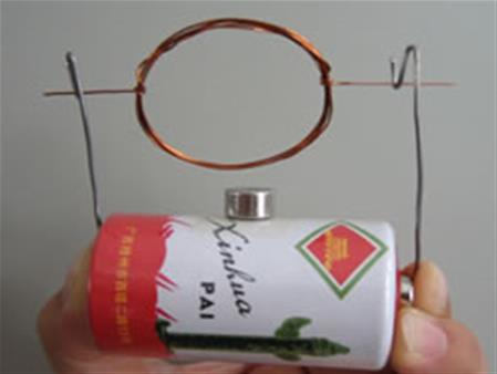 做一个电动机就这么简单!最让人叫绝的是其中换向器的省略。如果没有换向器,通以直流电的线圈在相邻的两个半周对称位置受到的力矩总是反向的,那么线圈就不能连续地转动。但这个电动机用的方法是使线圈只是在半个周期里通电,另半周期里断电。实现的方法是将线圈一端的引线上的绝缘漆全部刮掉,另一端只刮掉了半个侧面。实验方法简单得出奇,却漂亮得令人叫绝。