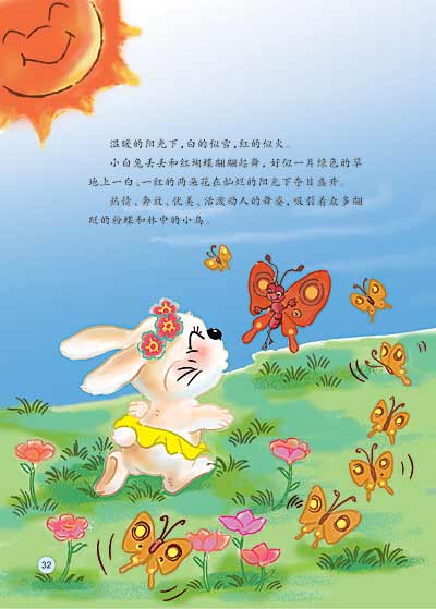 小白兔丢丢和红蝴蝶翩翩起舞,好似一片绿色的草地上一白、一红的两朵花在灿烂的阳光下夺目盛开。
