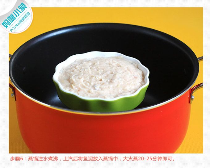 步骤6:蒸锅注水煮沸,上汽后将鱼泥放入蒸锅中,大火蒸20-25分钟即可。