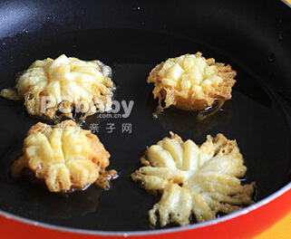 步骤4:炸至底部定型时,用筷子把菊花豆腐向外慢慢拨散,形成菊花状,把炸好的菊花豆腐放入碟中,摆好形状。