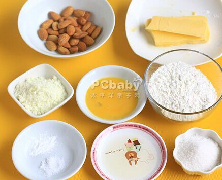 准备食材:低筋面粉150克、鸡蛋30克、泡打粉1/4小匙、奶粉25克、鸡蛋白15克、杏仁35粒、食盐1/4小匙、黄油100克、糖分50克。