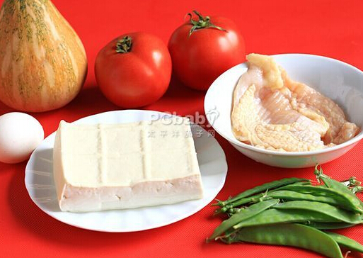 准备食材:鸡胸脯肉半块、北豆腐1/3盒、南瓜1小块、西红柿半个、荷兰豆少许、鸡蛋白1个、香菜少许、食盐少许、香油少许、水淀粉少许、高汤适量、白胡椒少许
