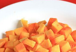 步骤1:南瓜去皮除籽,洗净,切小丁,豌豆粒洗净。