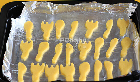 步骤5:取出,案板撒少许干粉,将面团擀开,成0.2cm厚,模具沾少许干粉,切割出形状。