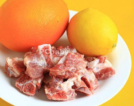准备食材:猪小排500克、橙子2个、食盐适量、酱油适量、柠檬汁少许、植物油适量、白糖适量