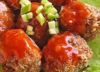 制作:先把肉末放入盆里,打入鸡蛋,加入面包屑、番茄酱、料酒、盐、水淀粉和姜末搅匀;将调好的肉末挤成小肉丸,放在温热的油锅里炸成金黄色捞出;炒锅里留少许底油,下入番茄酱炒一下,再放入盐、醋、料酒,放清水烧开,用水淀粉勾芡,倒入炸好的小肉丸,待小肉丸蘸满芡汁后,淋入香油即成。