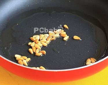 步骤4:将平底锅中倒入橄榄油,油温热后加入松子,炒出香味直至颜色变微黄。