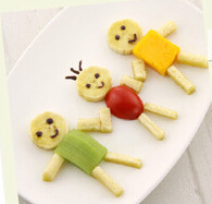 用香蕉、小番茄、猕猴桃、芒果拼出的小人儿造型,可爱的外观还有丰富的维生素,让孩子爱不释手。
