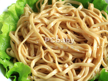 步骤6:把拌好的面条摆放在生菜叶子上,中间留个小窝。