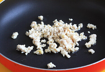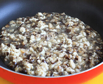 步骤5:在锅的另一侧,倒入香菇碎,用这一侧锅中的油将香菇碎煸炒1分钟,然后将鸡肉碎和香菇碎混合在一起。