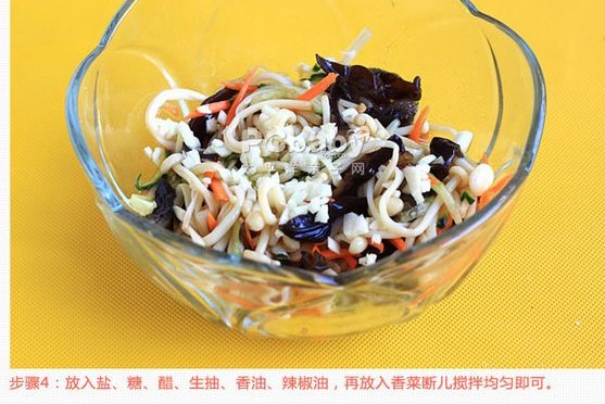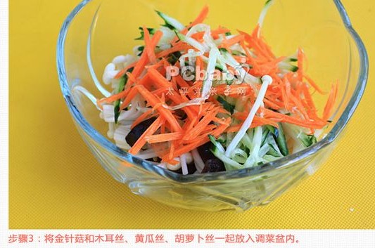 步骤3:将金针菇和木耳丝、黄瓜丝、胡萝卜丝一起放入调菜盆内。
